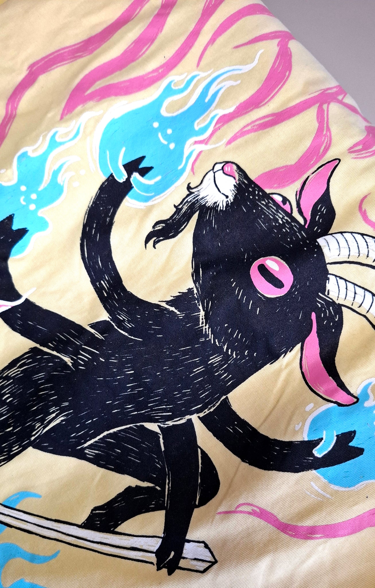Light yellow T-shirt of a demonic goat feeding souls to their flame buddies. Don´t worry, the souls don´t mind (look how happy they are!)