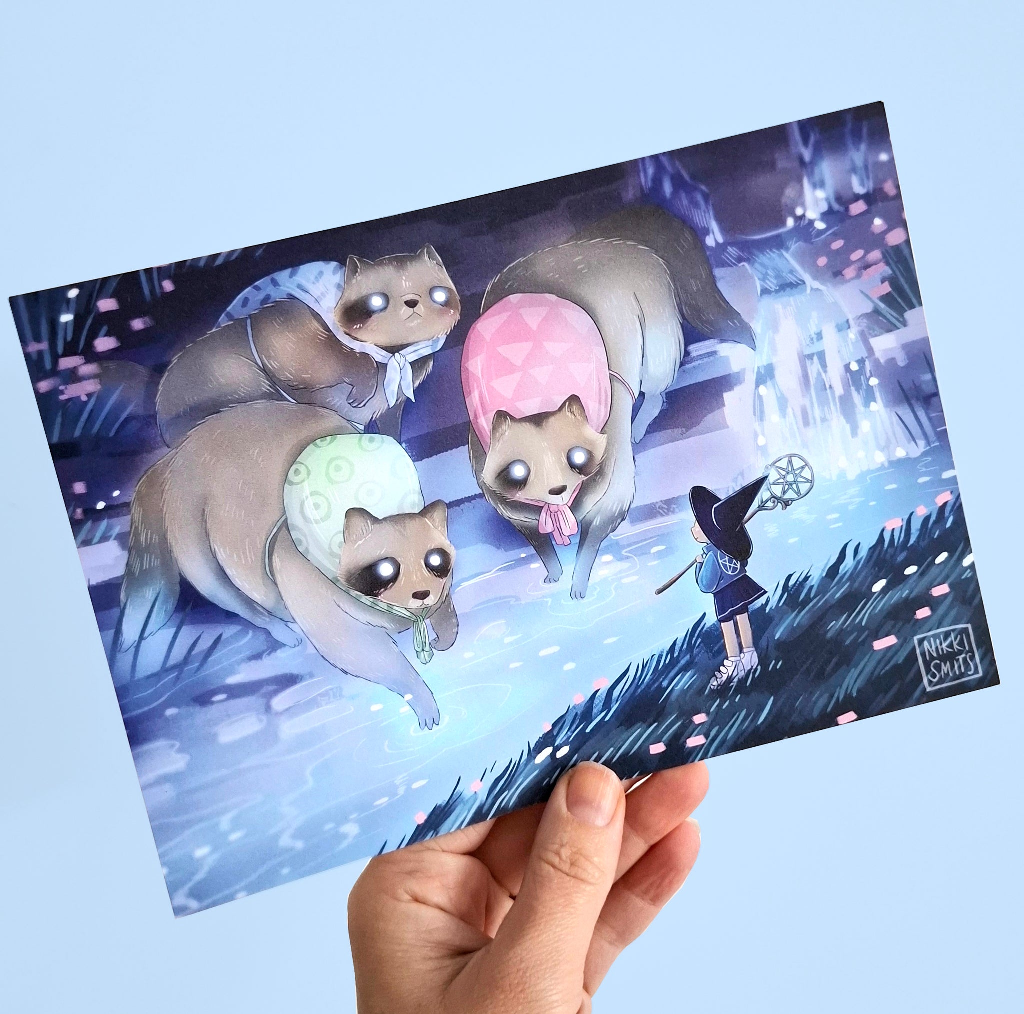 A5 art print of a witch meeting some magical Tanuki/raccoon dogs.