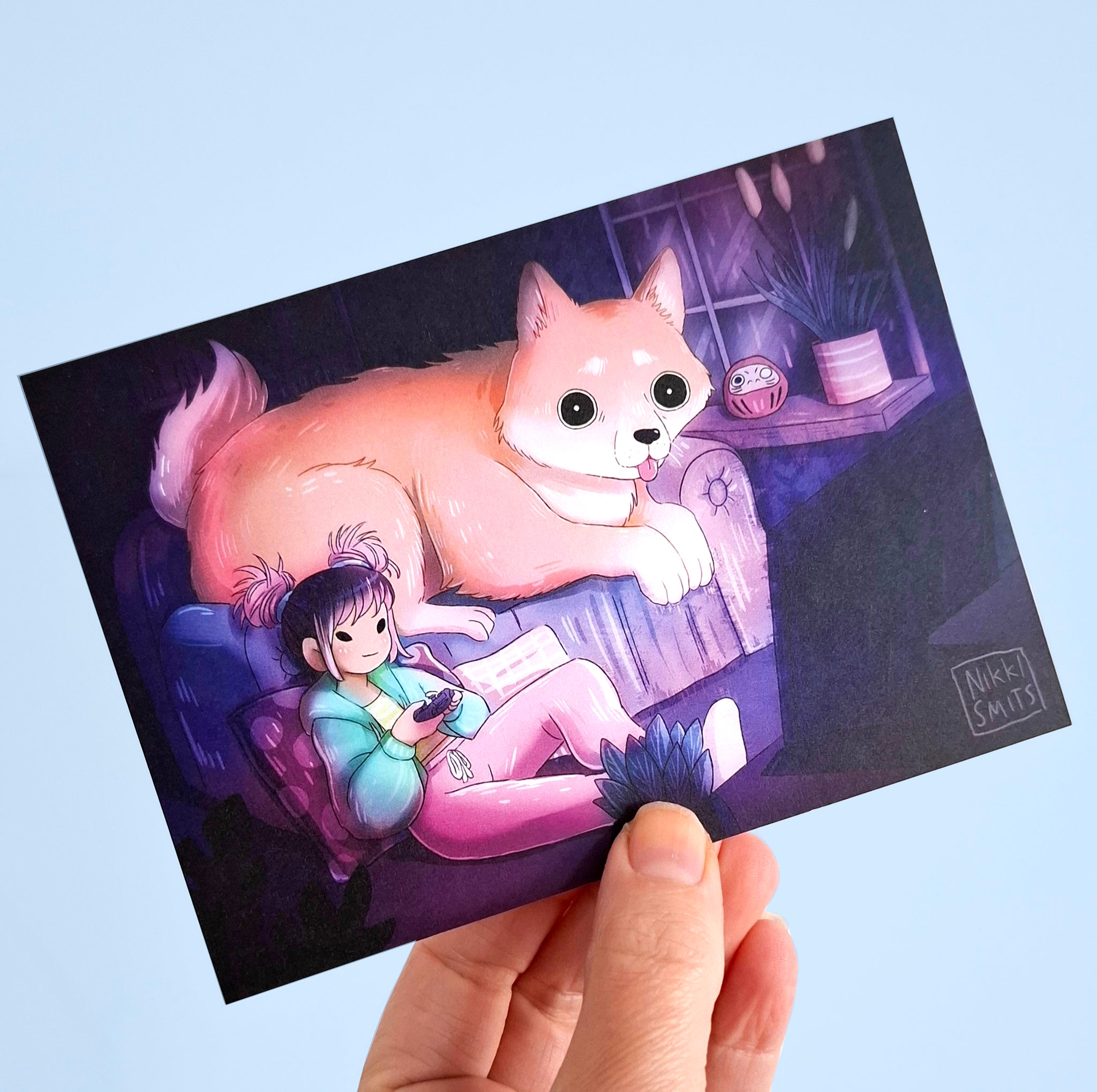 Single postcard of a girl playing video games.